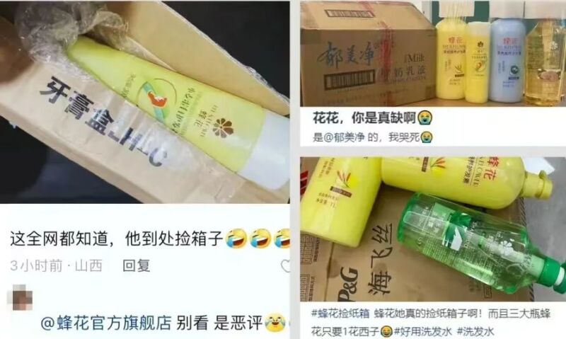 大家这样调侃,是因为去年花西子事件的时候,国货蜂花由于快递箱库存不足,就让员工去捡纸箱发货,其中甚至包括一些同类竞品的快递纸箱。