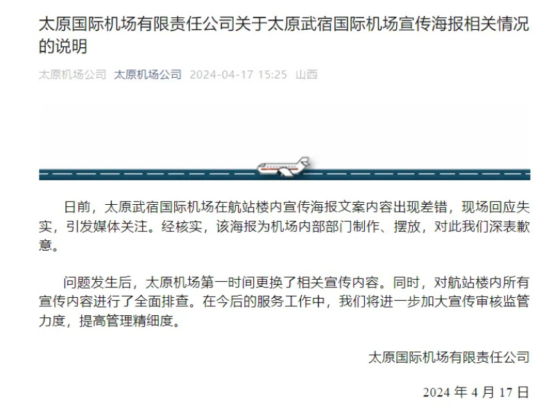 问题发生后,太原机场第一时间更换了相关宣传内容。同时,对航站楼内所有宣传内容进行了全面排查。在今后的服务工作中,我们将进一步加大宣传审核监管力度,提高管理精细度。
