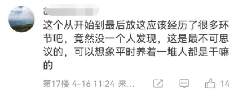 “这个从开始到最后放这应该经历了很多环节吧,竟然没一个人发现,这是最不可思议的,可以想象平时养着一堆人都是干嘛的”