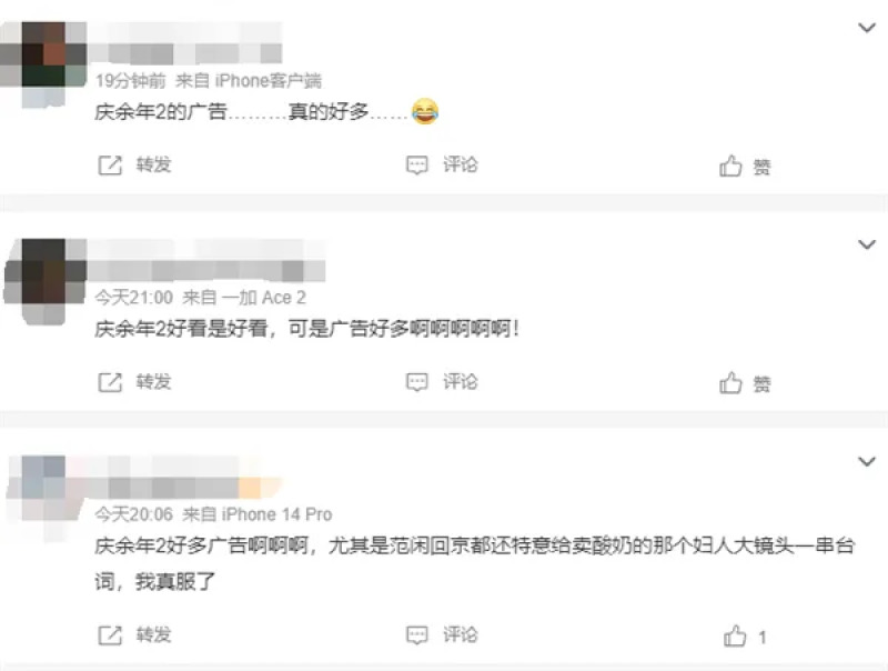 网友表示:“庆余年2好看是好看,可是广告好多啊啊啊啊啊”“庆余年2好多广告啊啊啊,尤其是范闲回京都还特意给卖酸奶的那个妇人大镜头一串台词”“庆余年火的五步一广告,十步一堆广告”等等。