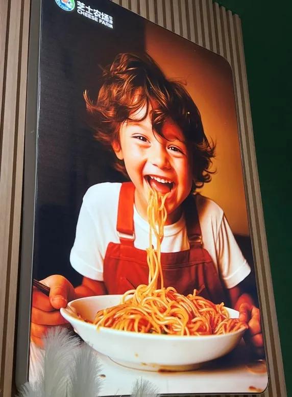 而除了用词不当,其它品牌的AI广告也有很多翻车的,比如芝士农场的小男孩吃意面海报就在小红书上引起网友热议,AI生成的小男孩手里捧着装有意大利面的碗,他开口大笑着,意面则从他的下嘴唇流出,看着十分渗人。