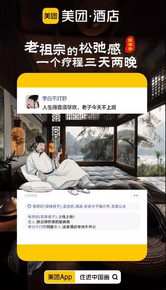 短片以将李白、陆游、李清照、苏东坡、白素贞等老祖宗度假住酒店发朋友圈为引子,打造创意透卡周边,邀请大家跟着很懂松弛感的老祖宗,来美团国风酒店,一整个松弛住。