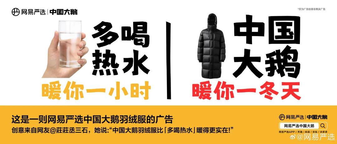 于是网易严选基于这样的洞察,火速邀请12只松花江雪域大白鹅成为网易严选羽绒服的代言人,并把网友的神评制作成了系列海报。
