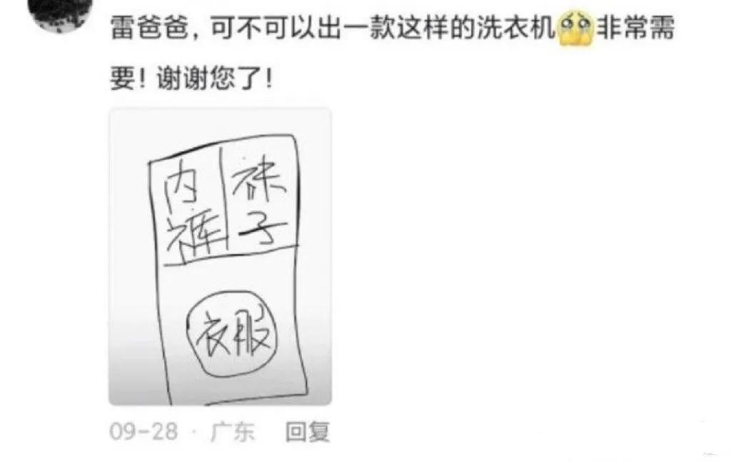 想到之前有网友想要一款可以将袜子、内裤、衣服分开洗的洗衣机,并且还给出一张手画稿。