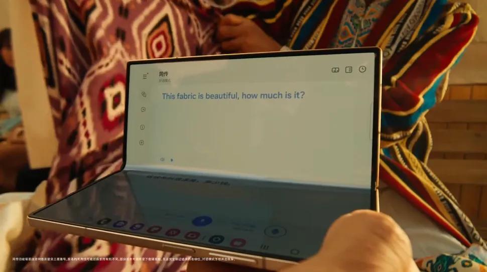 另外,三星在形式和细节上也有小心思,比如很多无言胜有声的情感表达,诸如广告中所展现的即时翻译、大屏幕办公等功能,解决了实际应用中的痛点,侧面强化三星W25系列作为高端科技产品的形象。