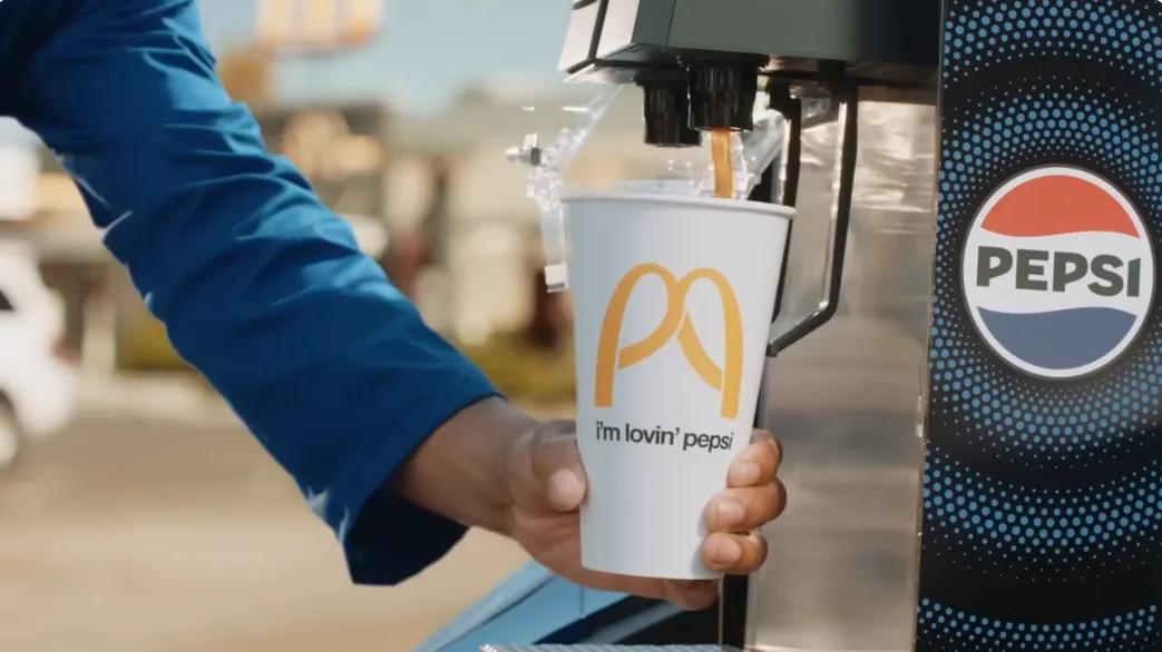 在这则“偷感”很重的广告视频中,可以看到百事可乐“卧底”计划的行动内容,将百事可乐的饮料机搬进快餐品牌门店,将顾客正在享用的可口可乐杯装饮料替换为百事可乐,杯子也悄然发生了变化,比如,温迪汉堡的红头发logo变成了百事可乐的蓝色,麦当劳汉堡的“M”标变成了两个“P”,下面还印着“I'm lovin'pepsi”(我就喜欢百事可乐)。