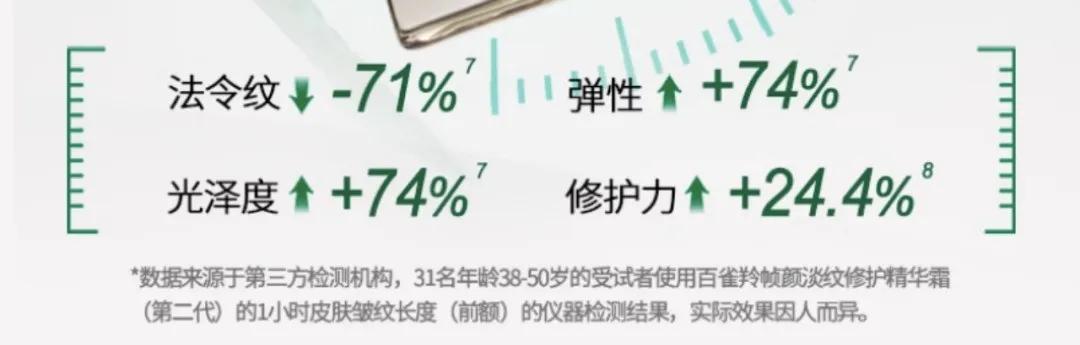 今年8月,百雀羚全新第二代绿宝石帧颜霜新品发布,宣传物料推介产品功效从“1小时即速淡纹28%”升级至“1小时即速淡纹37%”。