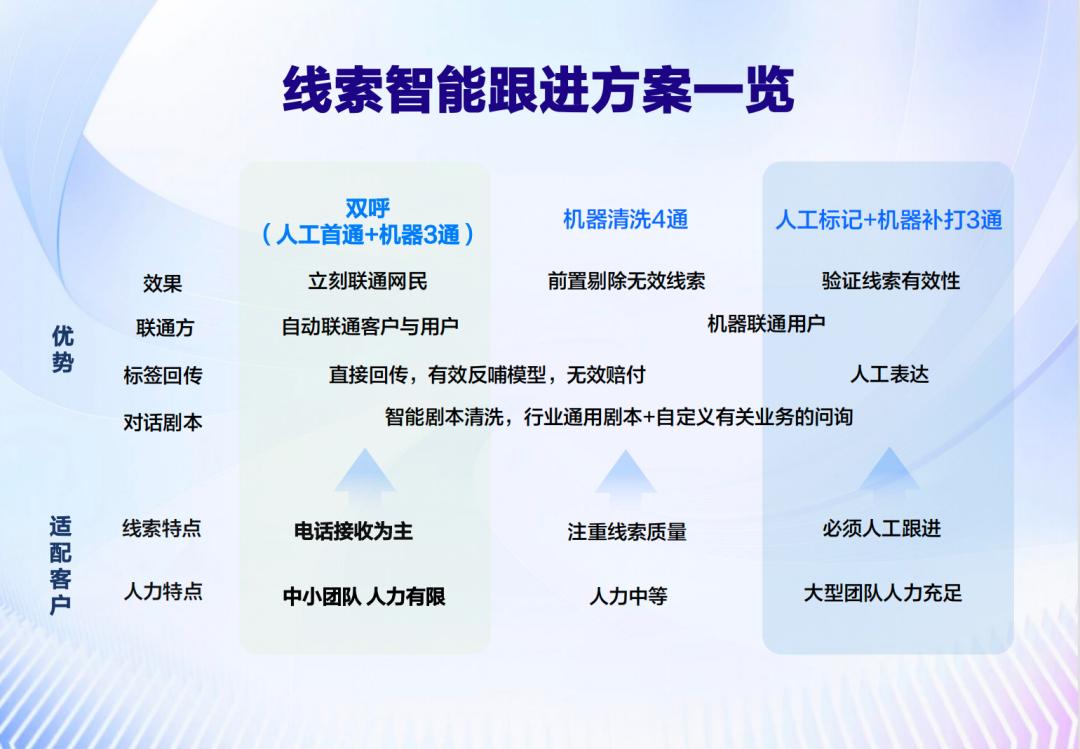 到了这一步,线索数量与质量已经双双达标,接下来就是如何跟进线索,让客户留资转化为实际销量。对此,商家智能体设计了多套跟进方案,能够运用人工或机器智能呼叫技术,完成线索跟进,进一步筛选有效线索。