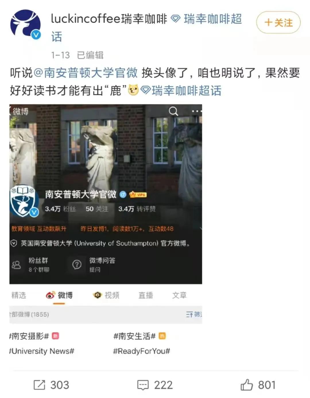 但是跟蔚来的处理方式不同,瑞幸当时还玩了一把谐音梗调侃南安普顿大学:果然要好好读书,才能有出“鹿”。