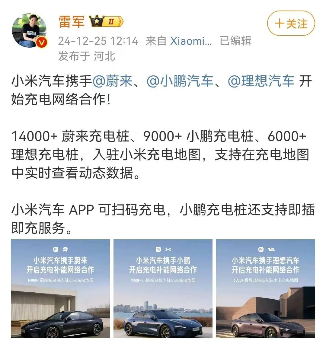 小米创始人、董事长兼CEO雷军,近日在微博发文称——小米汽车携手蔚来、小鹏、理想三大造车新势力,正式开启充电网络合作。
