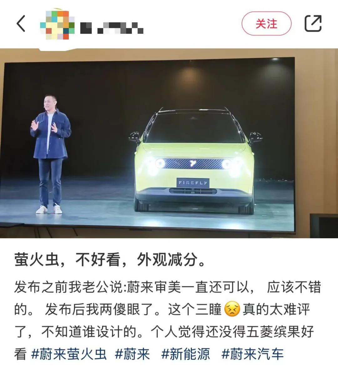 但毕竟是蔚来,大家对它的审美一定是高期待的,但高期待的审美,却给了一个让很多大众心里别扭的结果,大家不禁要问:李斌真的觉得萤火虫这个设计好看吗?为啥蔚来内部没有阻止这件事的发生?