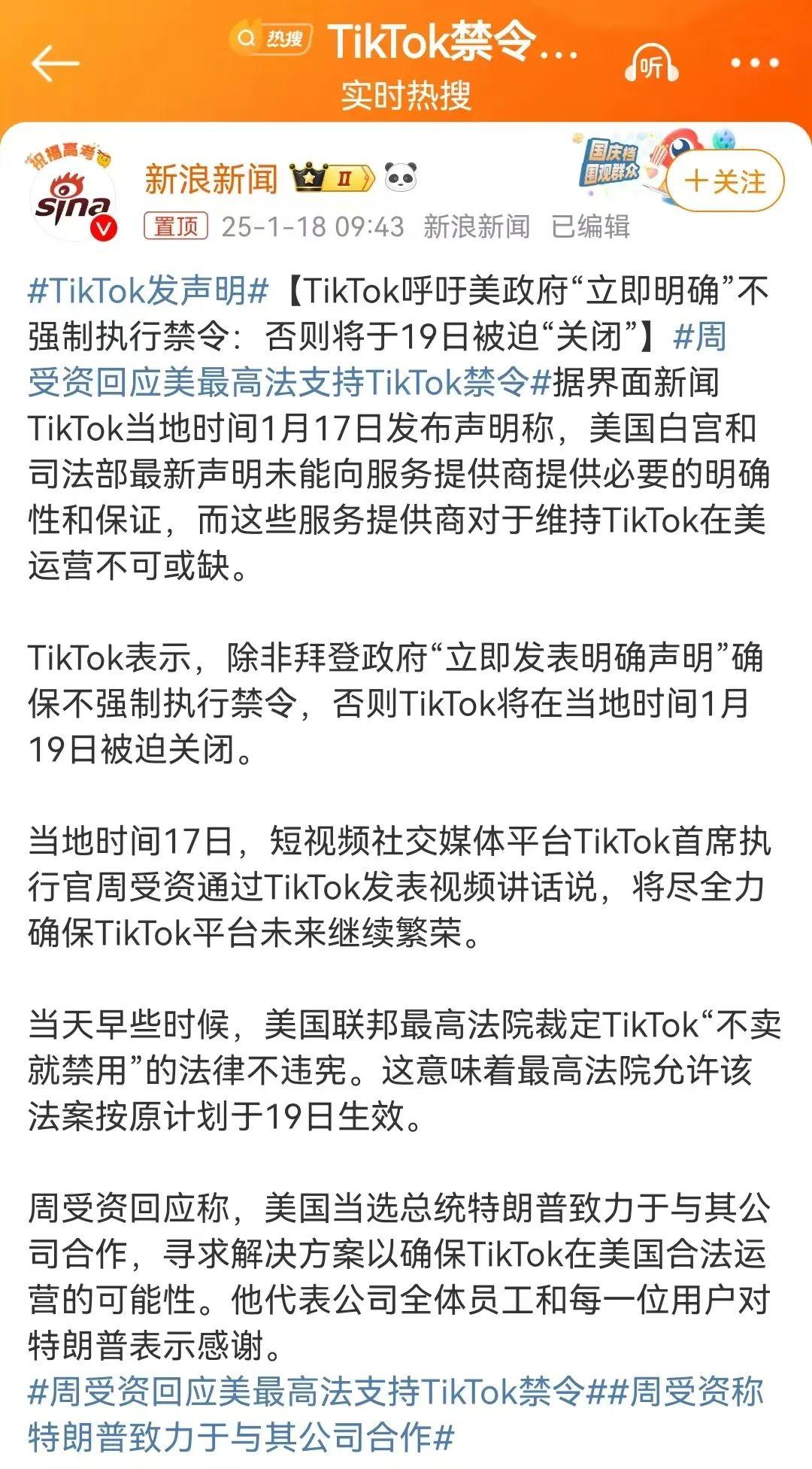 大家好,今天苏秦在互联网上冲浪的时候,看见一条#TikTok发声明#的微博热搜,这才意识到美国最高法院裁定TikTok“不卖就禁用”的法案,即将按照原计划于当地时间1月19日正式执行了。