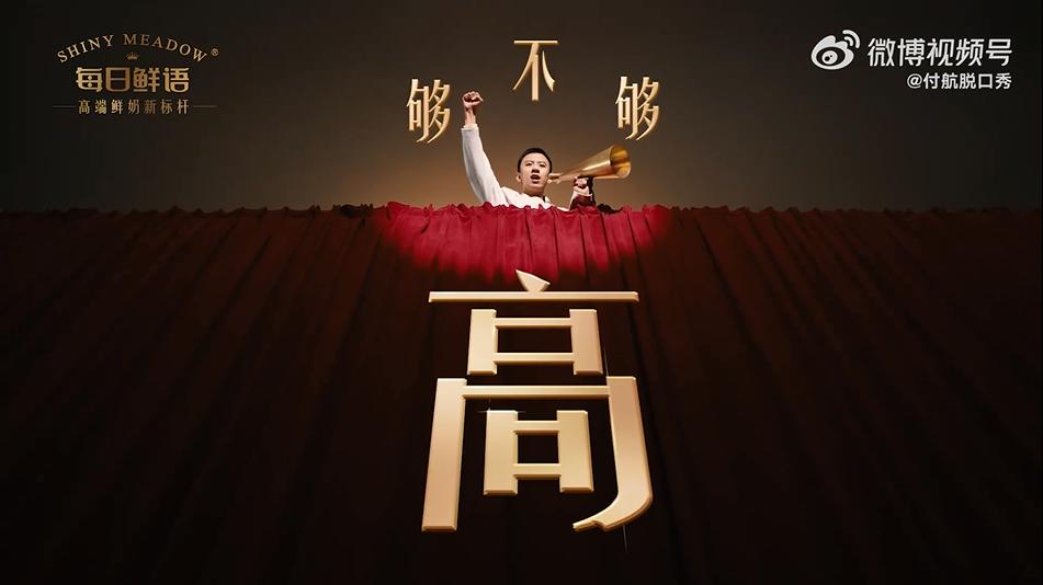 短片设置了一个观众非常熟悉的脱口秀场景,通过观众不断要求付航“高一点”制造悬念,激发观众好奇心,让观众好奇付航到底要怎样达到观众的“高”要求。付航从站在舞台,到站上梯子,再爬到幕布顶端,直到最后付航拿出每日鲜语,说出“品质高才是真的高”,既解开了悬念,又巧妙地将产品特性与之前的情节联系起来,让观众深刻记住了每日鲜语 “品质高” 的特点。
