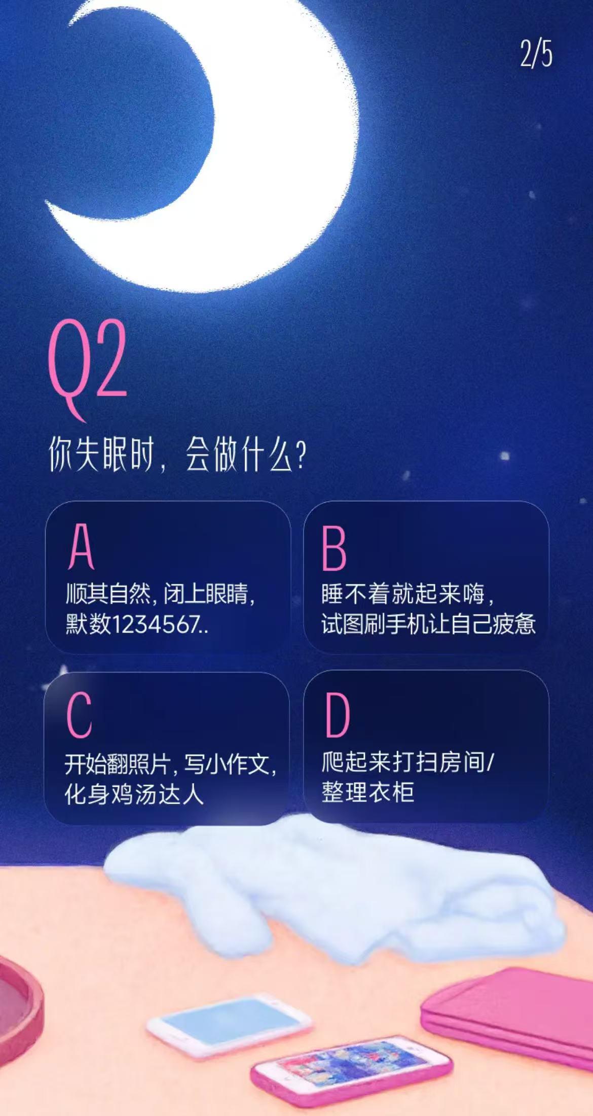 活动期间,用户在app搜索“失眠搭子”即可进入页面参与H5测试,该测试涵盖失眠原因、失眠时的行为习惯、期望拥有的助眠超能力、理想失眠搭子的特质偏好等多个维度,通过这些细致的问题,平台能够收集到用户丰富的个性化信息,并据此为用户匹配相应音乐。