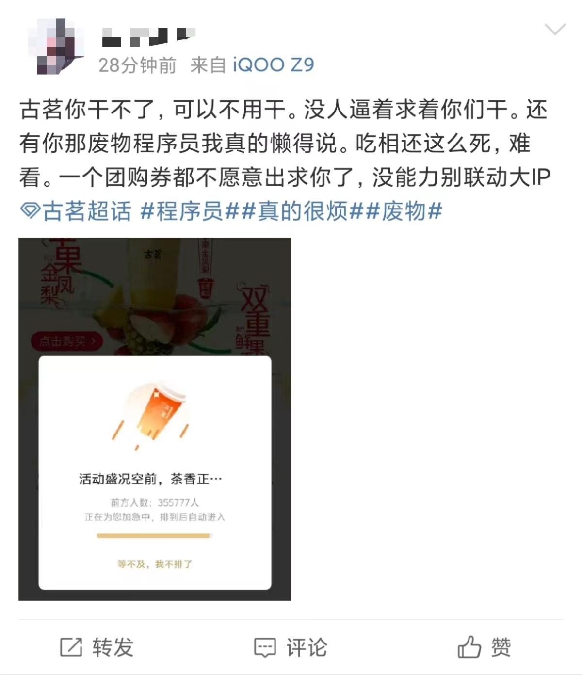 不过,造成这种百万人排队现象的原因,一方面是《崩坏:星穹铁道》本身就极受二次元圈层欢迎,IP粉丝数量极为庞大。另一方面,古茗的小程序在活动开启后就出现了严重卡顿现象,甚至还有不少网友喊话古茗“没能力就别联动大IP”。