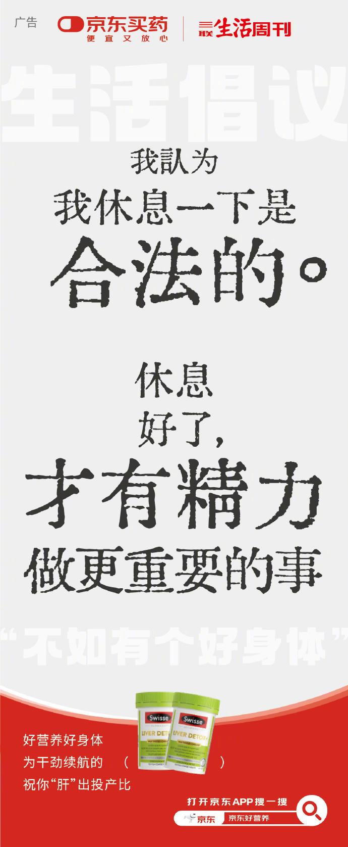 京东买药精准捕捉年轻人的生活焦虑与健康诉求,携手三联生活周刊,共同打造了一组海报,鼓励所有年轻人好好休息。