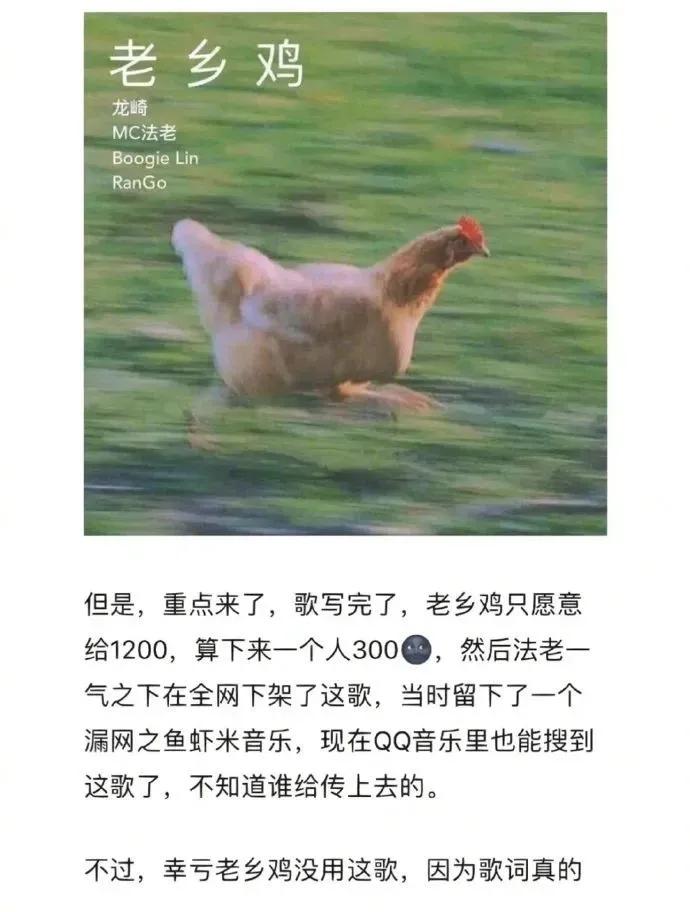 于是Rapper法老和龙崎就这样写下了人生中第一首广告曲《老乡鸡》,不过是被中间商赚差价情况下写的歌,并且歌词也很离谱导致最后老乡鸡没有采用,但品牌还是给了辛苦费,真的很搞笑。