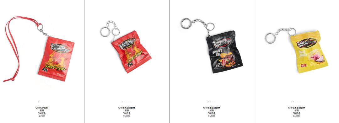 前段时间,巴黎世家北京三里屯太古里旗舰店开业,为配合新店开业,巴黎世家特别发布了一系列限定单品,其中就包括上述北京烤鸭主题手袋,还有这款上线官网售卖的CHIPS挂饰/钥匙链,一共有四种颜色,售价6500元。